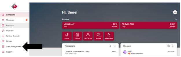 To access Cash Management services, such as the full business bill pay site, ACH, Wires, Positive Pay, Remote Deposit Capture (must be enabled) and Manage Users, navigate to the CASH MANAGEMENT tab on the Dashboard. To go back to the Dashboard, click on Dashboard.