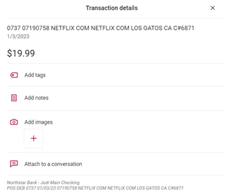 - Select an individual transaction to view transaction details and images. From Transaction details you can see the merchant’s name and location, date the purchase was made, the amount, and the last 4 digits of the account of the debit card that was used, if applicable.