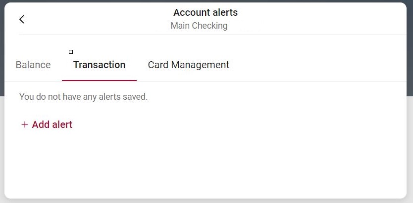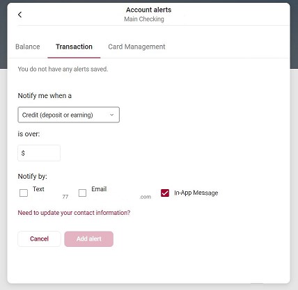 Account alerts will notify you when a deposit or withdrawal for a specified amount is transacted on the account.